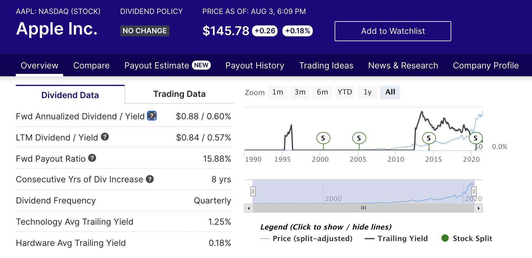 애플은 전세계 10억 명의 팬덤을 보유한, 단연코 세계 1등 테크 기업이다. 한 입 물다 만 사과 마크는 이제는 고급과 트렌드를 의미하는 심벌로 자리 잡았다. 애플은 단순히 핸드폰, 노트북 및 주변기기를 생산하는 하드웨어 회사가 아니다. 이미 구독 서비스를 통해 어마어마한 수익을 벌어들이고 있는데, 그 비중이 해마다 증가하여, 2021년 2분기 기준으로 순이익의 21%를 차지하고 있다. 또한 애플은 지속적인 성장을 위하여, AR 글라스, 전기자동차 등 사업 다각화에 힘쓰고 있다. 애플은 주주 친화적인 기업이기 때문에 자사주 매입을 통해 주가를 방어하고, 주주 가치를 제고하기 위해 힘쓰고 있다. 배당금 또한 지난 8년간 꾸준히 상승하며, 주당 $0.88을 지급하고 있다.