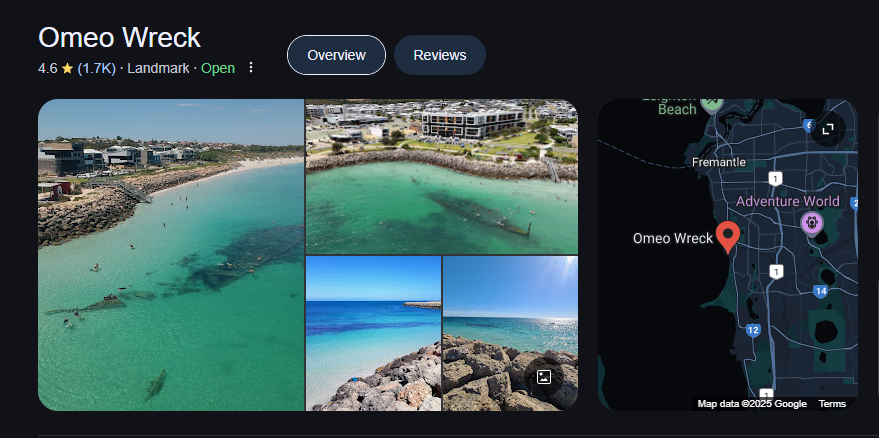 난파된 배의 이름이 Omeo이며, 1905년 강한 폭풍에 떠밀려 Coogee Beach에 좌초되며 난파되었다고 한다.
