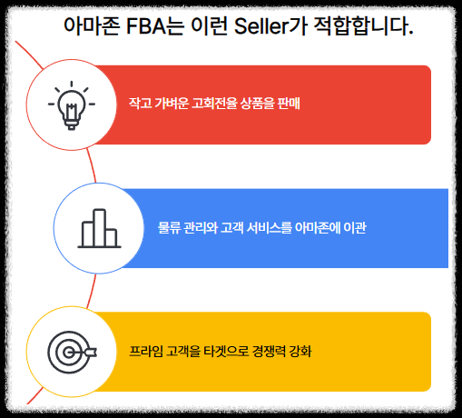 - 이유: FBA는 포장, 배송, 고객 응대, 반품까지 아마존이 처리해줘 시간과 노력을 절약할 수 있습니다.