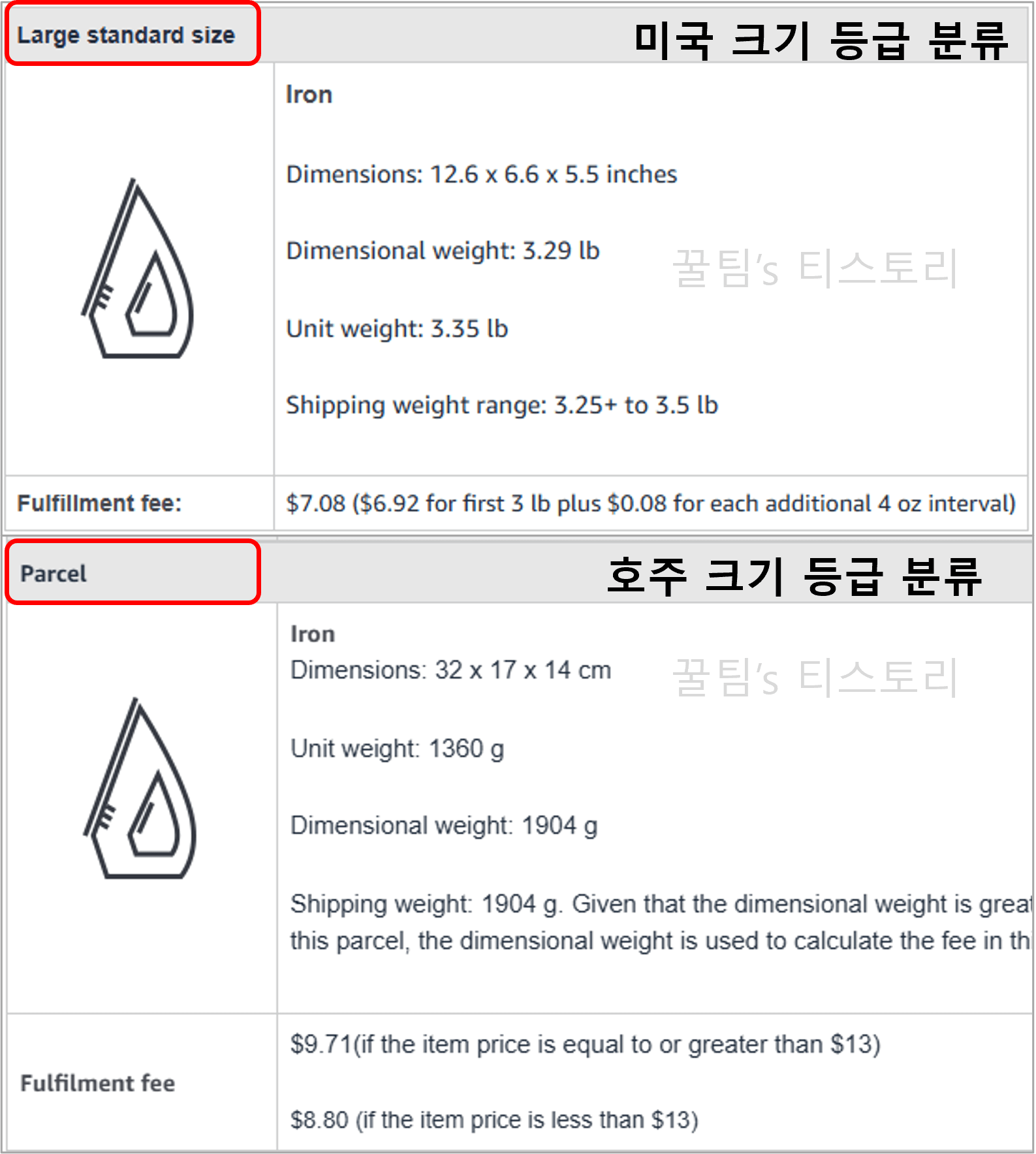 아래 사진은 만약 아마존에서 다리미를 판매 할 때, 미국와 호주에서의 다리미 크기 등급 분류 입니다. 미국은 인치를 쓰고 호주에서는 cm 단위를 쓰는데요, 단위 변환을 하면 아래 다리미의 크기는 동일합니다. 동일한 크기의 다리미를 미국에서는 Large standard size로 분류를 하고, 호주에서는 Parcel로 분류를 하고 있습니다.