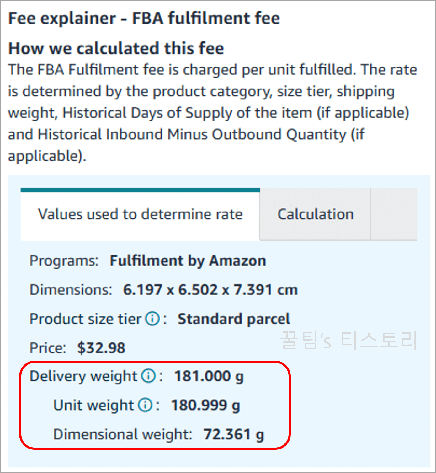 앞서 설명 드린것 처럼, FBA 수수료는 부피 무게와 제품 단위 무게(포장된 상태에서의 실중량) 중 더 무거운 쪽을 기준으로 계산 됩니다.