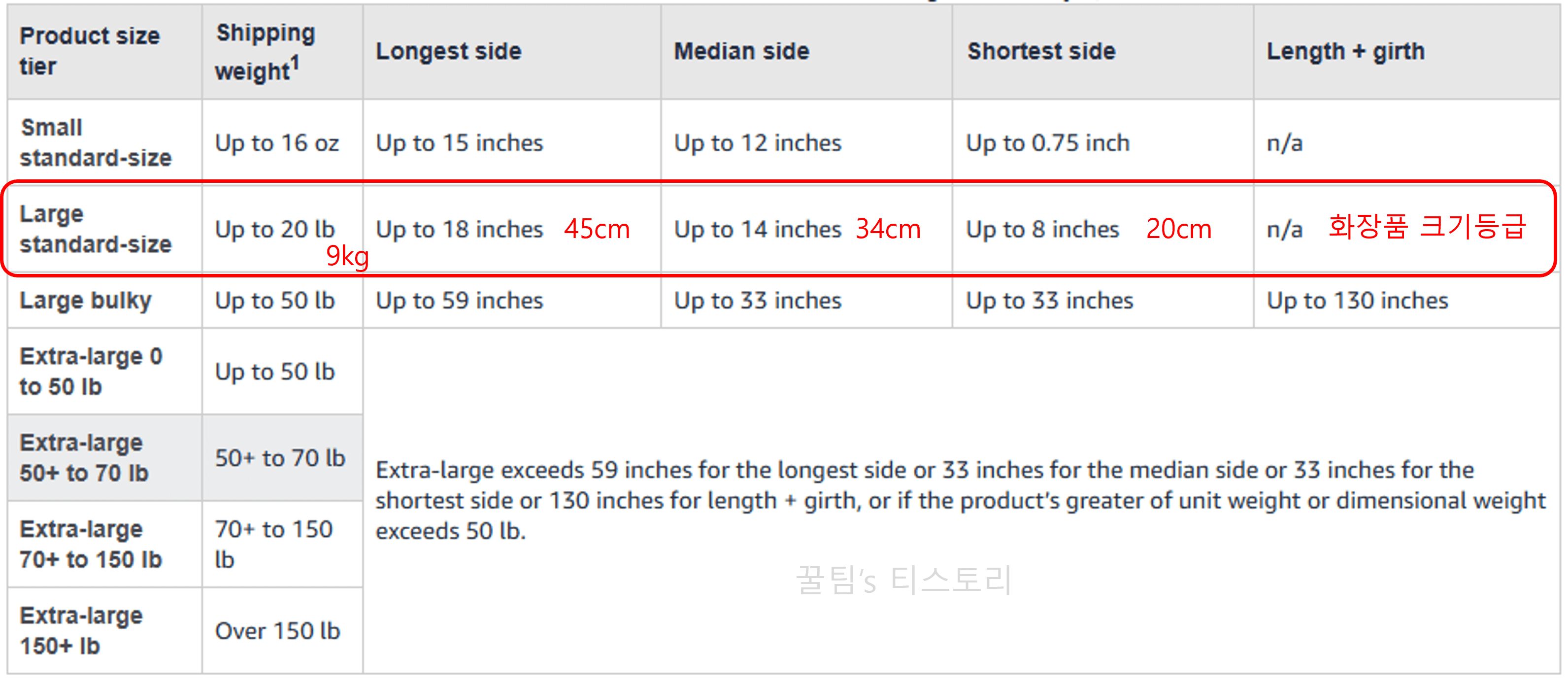 이 등급의 제품 크기는 **18 in (45 cm) x 14 in (34 cm) x 8 in (20 cm)**이며, 시중에 판매되는 일반적인 수분크림의 포장이 완료된 크기가 각 변이 ±7 cm 인점을 감안하면, 화장품은 해당 분류 내에서는 비교적 작은 편에 속합니다. 즉, 화장품 포장을 다소 키우더라도 제품 크기 등급은 변하지 않으며, FBA 수수료는 무게에 따라 결정된다는 말과 동일합니다.