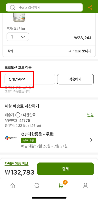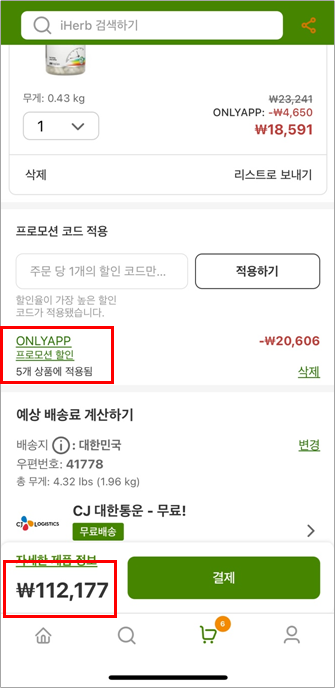 장바구니로 이동하여, 프로모션 코드에 ONLYAPP을 적용하면, 20% 할인이 적용된다.