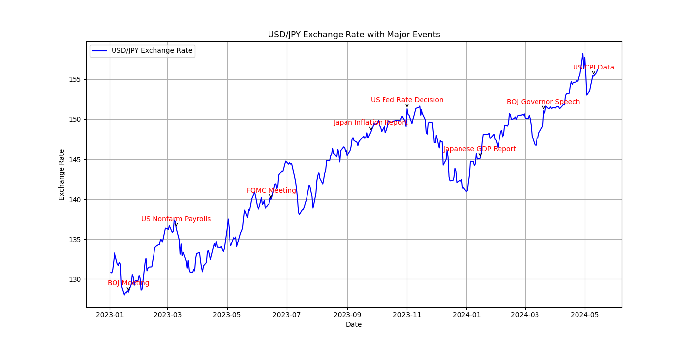 주요 경제 이벤트를 고려하여 엔화의 변동성을 이해하는 것이 중요합니다. 아래는 2023년과 2024년에 있었던 주요 경제 이벤트입니다: