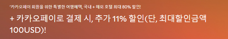 카카오페이로 결제만 해도 무려 11%나 추가 할인을 받을 수 있습니다. 특히 고가 호텔이나 장기 투숙을 계획 중이라면 더욱 큰 혜택을 누릴 수 있습니다.