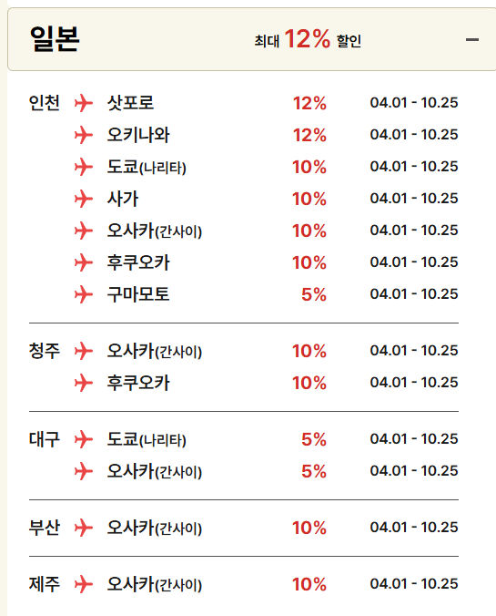 * 일본 : 도쿄, 오사카, 삿포로 등 최대 12% 할인
