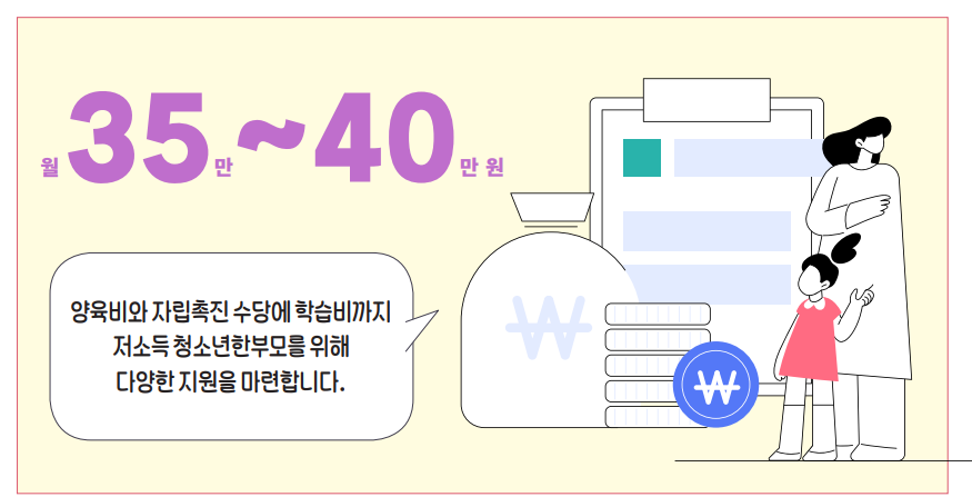 | 저소득 청소한부모 아동양육및 자립지원 월 35~40만원 지원 |