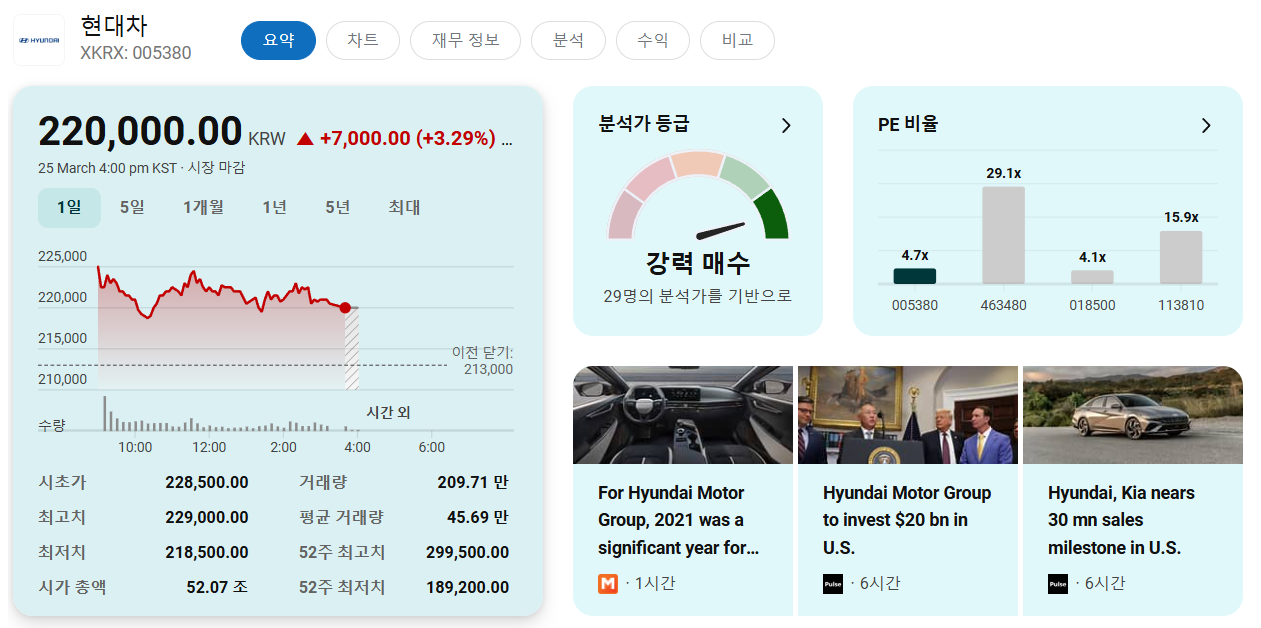 31조 대미투자’ 현대차, 주가 상승 이유는?2025년 3월 25일 현대차 주가가 3.3% 상승하며, 종가 22만원에 마감하였습니다.주가 상승 요인은 현대차에서 31조 대미 투자계획을 발표 했고, 이에 따라 미국 IRA법(인플레이션 감축법)에 따른 관세 및 보조금 불이익 우려가 줄어들었기 때문입니다. 현대차 미국 투자 히스토리 현대차는 이번 31조 원 투자 이전에도 꾸준히 미국 내 생산 거점을 확장해 왔습니다. 단순한 일회성 투자가 아닌, 전략적인 ‘미국 내 전기차 생태계’ 구축이라고 볼 수 있습니다.연도투자 내용비고2005미국 앨라배마 공장(HMMA) 가동 시작연 40만 대 규모, 내연기관차 생산 중심2011기아차 조지아 공장 본격 가동현대차와 부품 공유, 시너지 창출2022미국 조지아주 전기차 ..